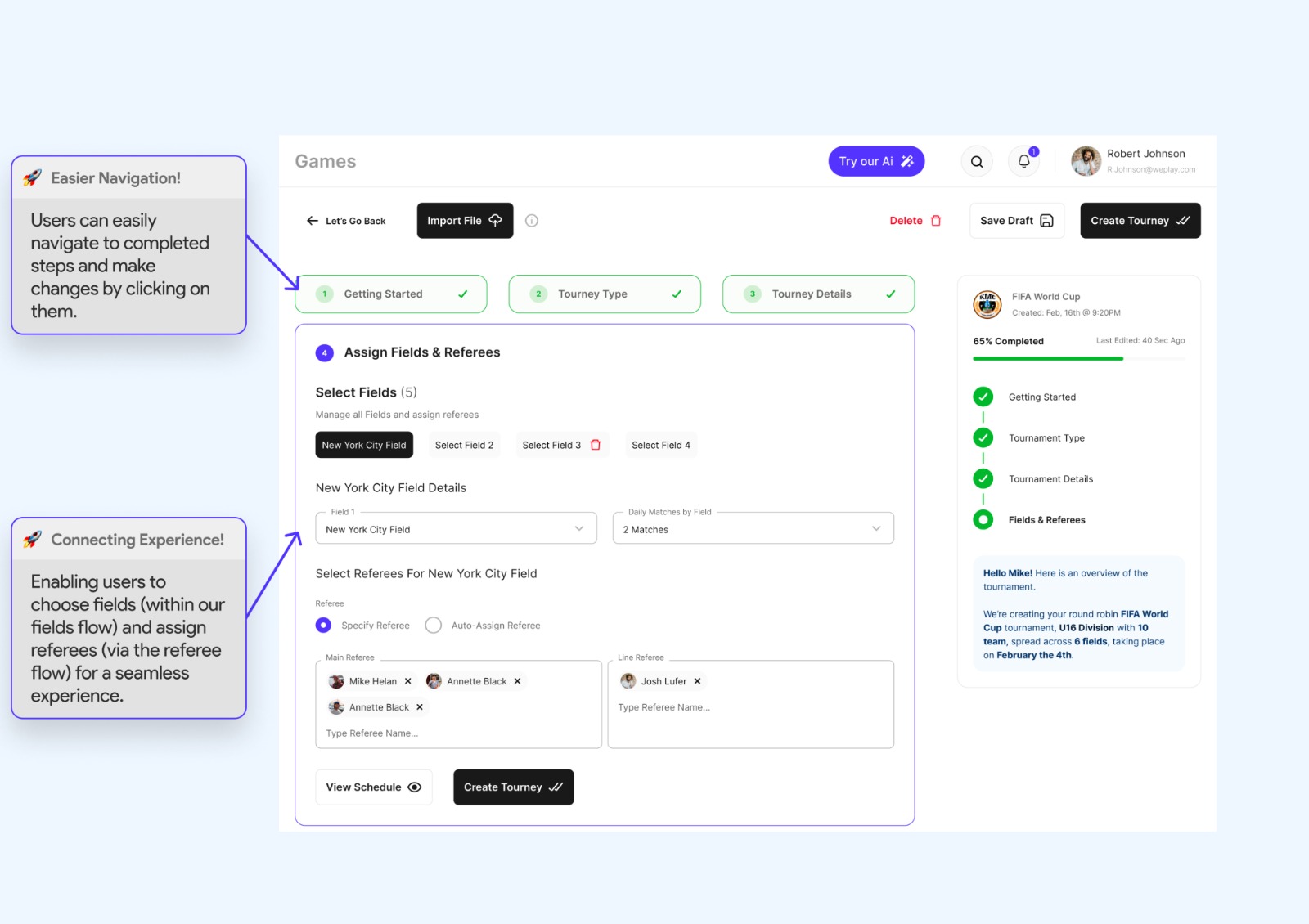 When compared to other competitor products where users juggle multiple tools, our platform stands out. We've unified players, teams, waivers, fields, referees, and communication flows which are seamlessly connected with the games flow. This consolidated approach empowers users with complete control in a single, user-friendly space during the scheduling process.
